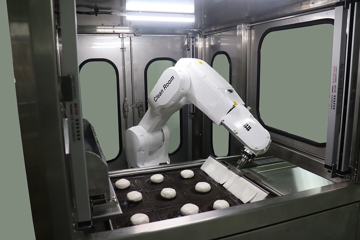 Through the programming of the ABB robotic arm, we have designed 16 different types of bread painting modes. Customers can use the human-machine interface to select the painting modes of different sizes and shapes of bread, replacing two laborers— maintaining the product quality while saving labor costs.